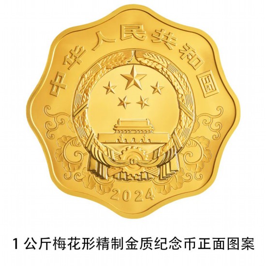 1公斤梅花形金质纪念币为精制币,含纯金1公斤,外接圆直径100毫米,面额10000元,成色99.9%,最大发行量118枚。