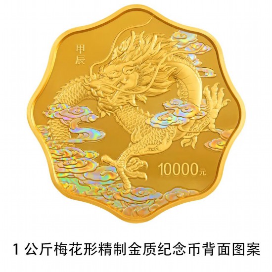 1公斤梅花形金质纪念币背面图案为龙造型,衬以祥云组合设计。